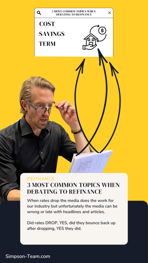 COST, the common question is how much this is going to cost me and how fast will I make up this cost if I invest the money into the refinance. If you are going to refinance and you can make up the cost in 3 years or less, it make sense. If you plan on staying in your house or this mortgage for 10 + years, then this might not matter as much because long term it will be worth it to refinance.